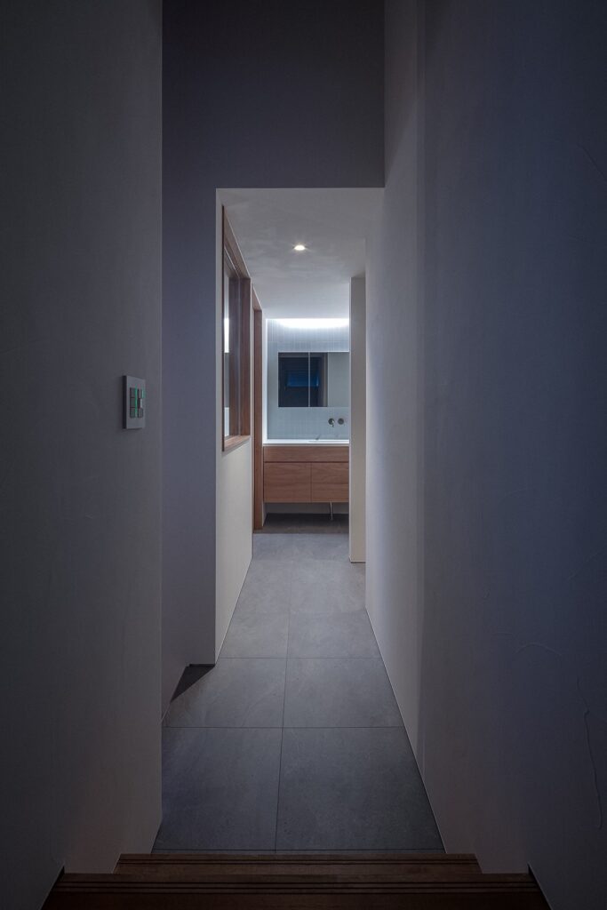LDKと廊下はドアで仕切らず、廊下が2段下がった段差で自然に空間が分かれています。この2段下がった部分はすべてフロアタイルでひとつながりになっていて、水が飛びやすい場所なのにサッと拭けるのがとても便利です。